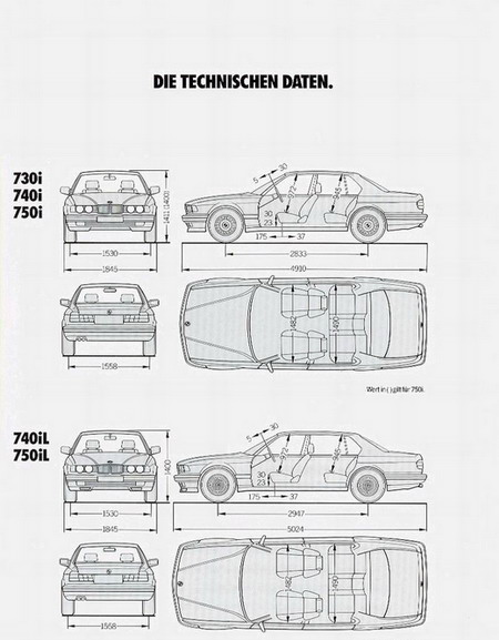 Первенцем стала BMW 735i с рядным 6-цилиндровым 3,45-литровым инжекторным двигателем (M30B34) мощностью 218 л.с. (211 л.с. с каталитическим нейтрализатором) и разгоном до сотни за 8.3 секунды. Максимальная скорость составляла 230 км/ч.